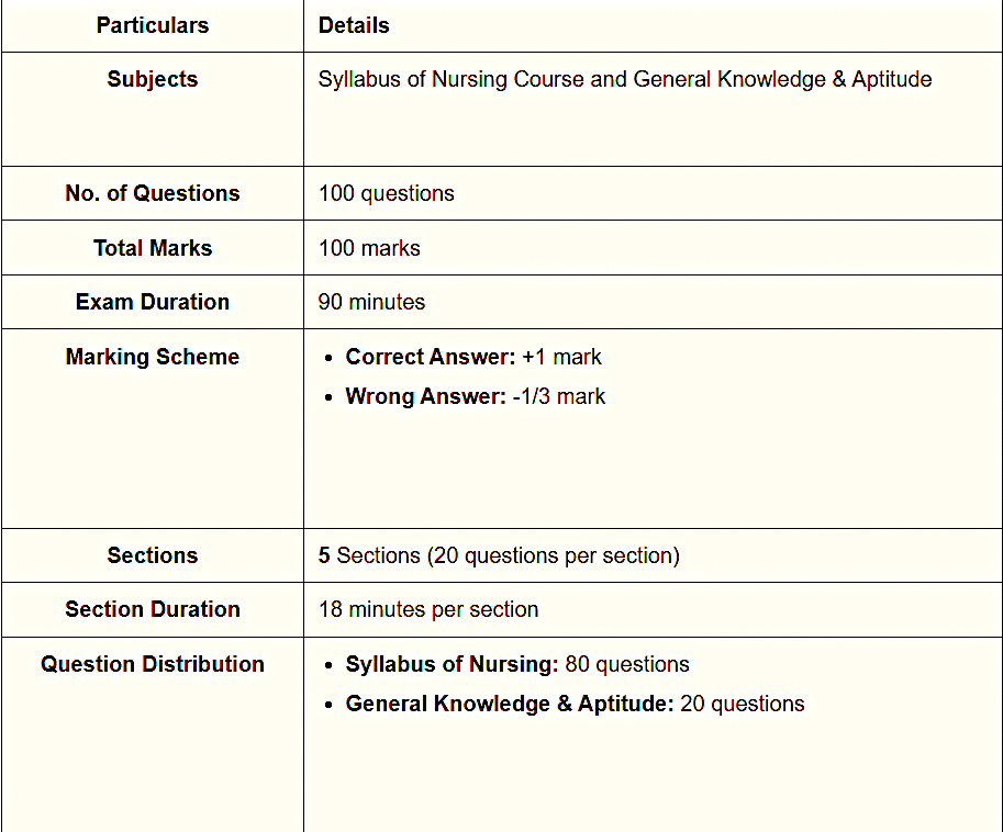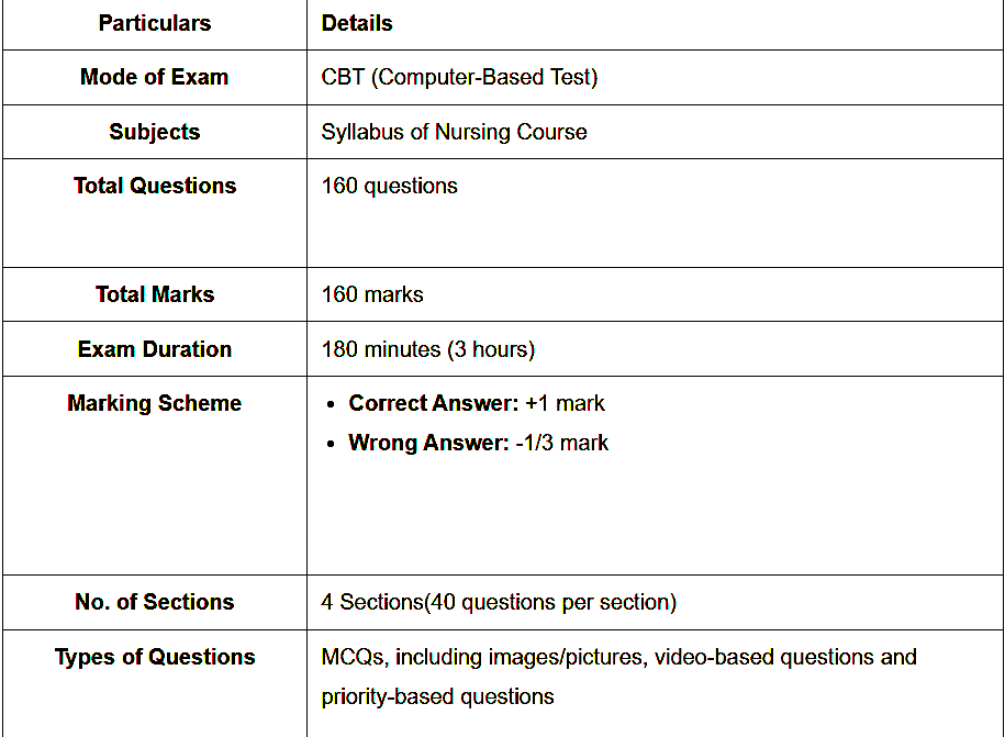 The AIIMS NORCET 10 Exam 2026 is structured in two stages: the Preliminary Exam and the Main Exam. The Preliminary Exam consists of 100 questions covering both Nursing and Non-Nursing topics. The Main Exam will be conducted in Computer-Based Test (CBT) format, featuring 160 questions divided across four sections. Below is a detailed breakdown of the AIIMS Nursing Officer Exam Pattern 2026 for both stages: