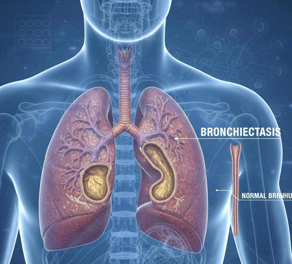 Bronchiectasis is a chronic lung condition where the airways (bronchi) become permanently widened and damaged due to repeated inflammation or infection. This structural damage causes mucus to build up, making it difficult for the lungs to clear bacteria and other harmful substances. Over time, this can lead to persistent cough, shortness of breath, and frequent respiratory infections.