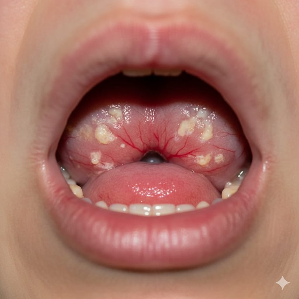 • Pus or white patches on tonsils (sign of bacterial infection).